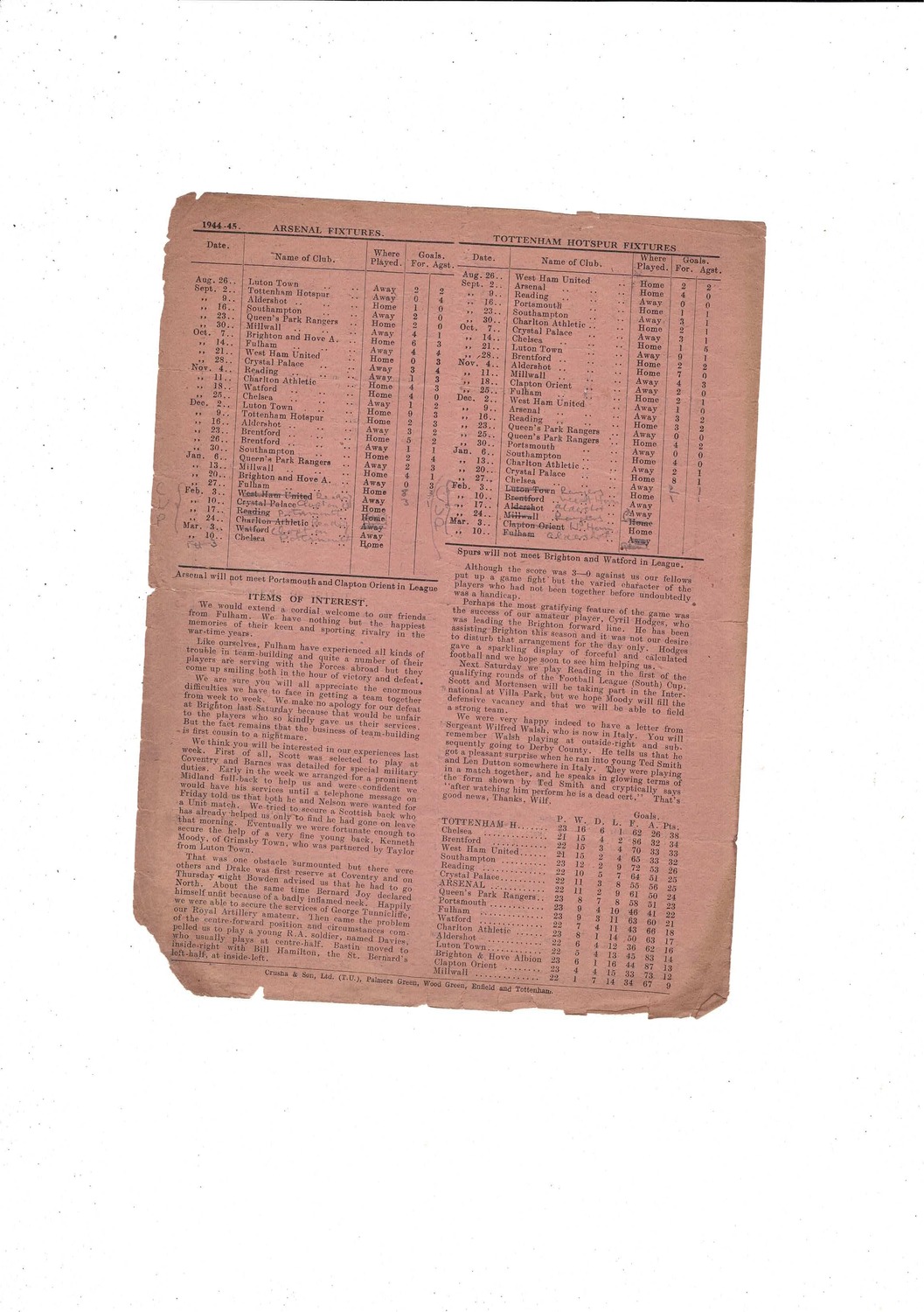 1944/45 Arsenal v Fulham League South Cup Football Programme