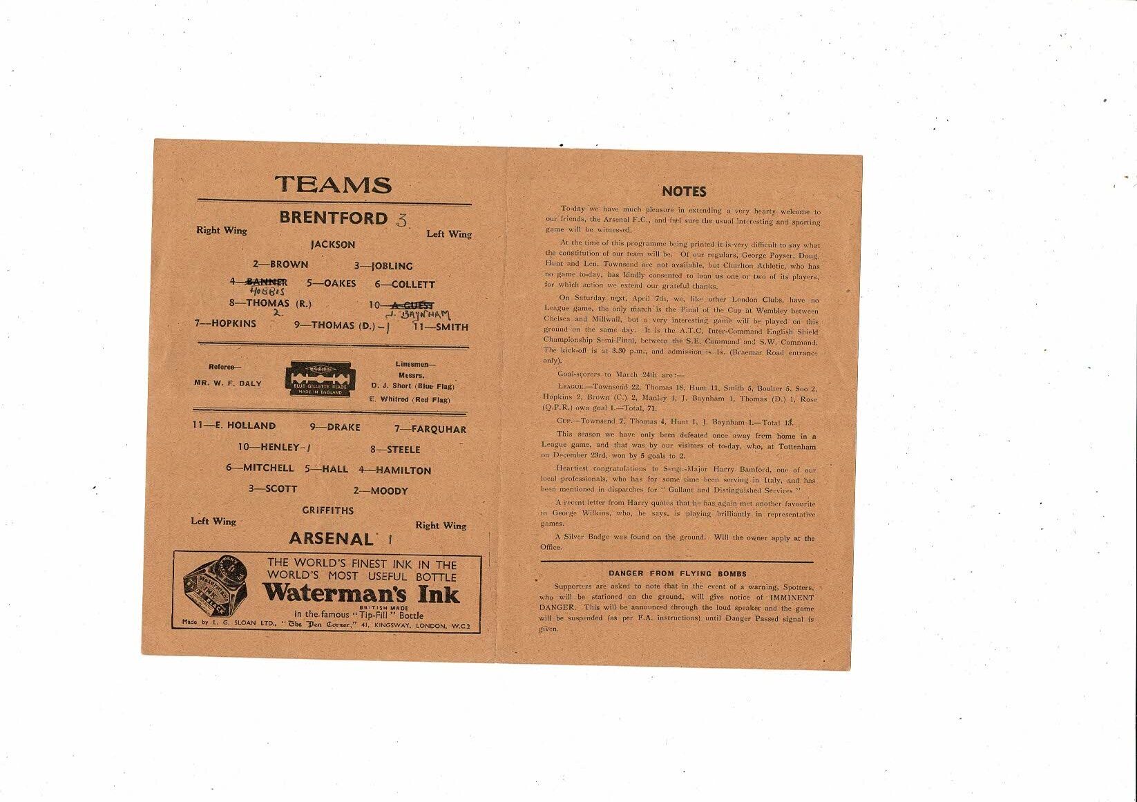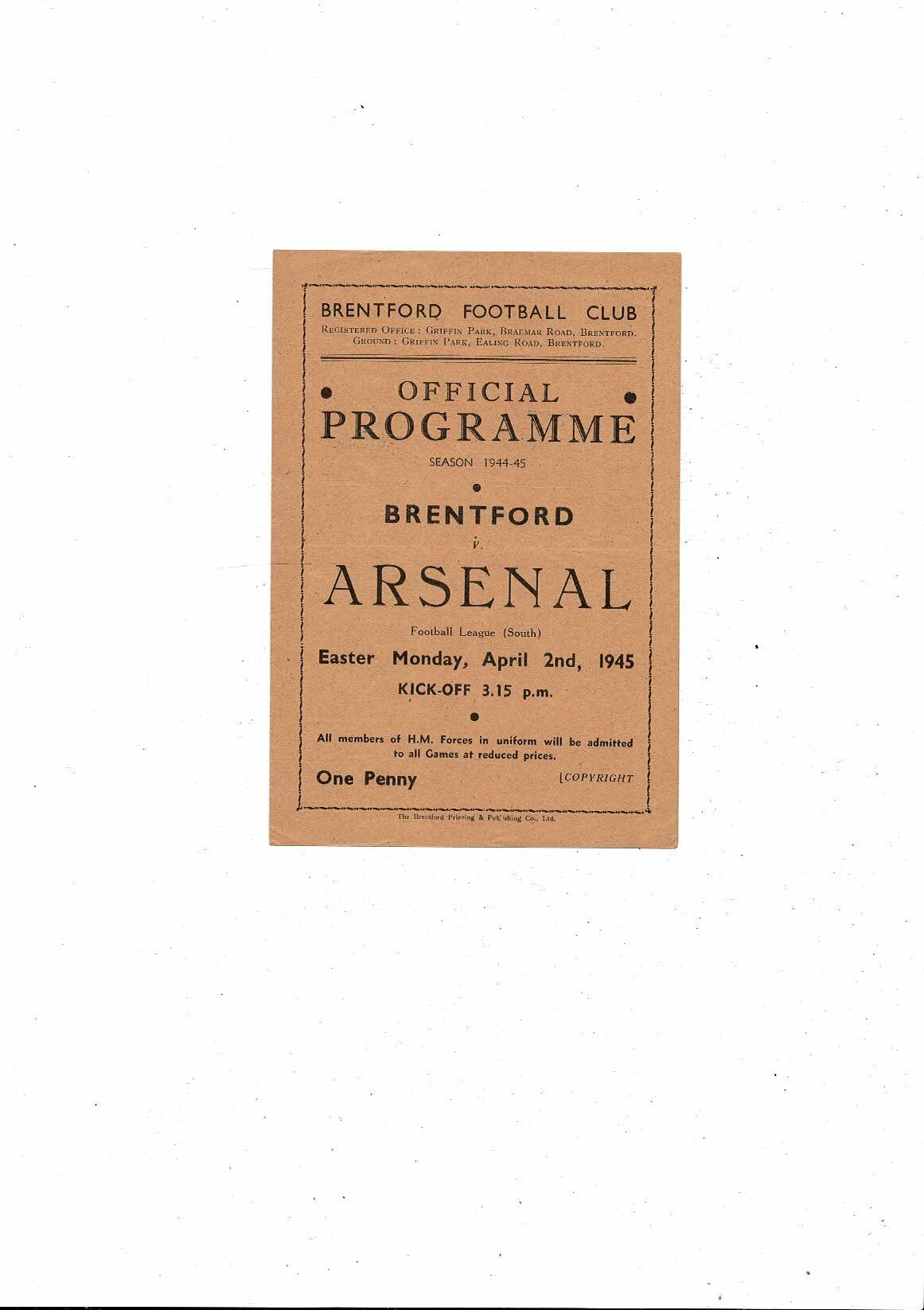 1944/45 Brentford v Arsenal Football Programme April