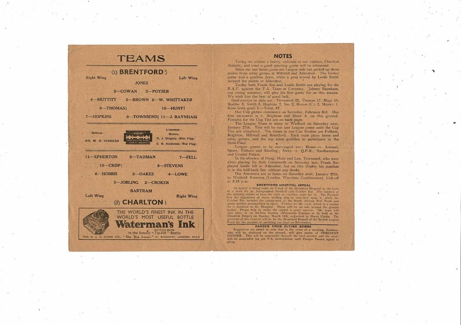1944/45 Brentford v Charlton Athletic Football Programme