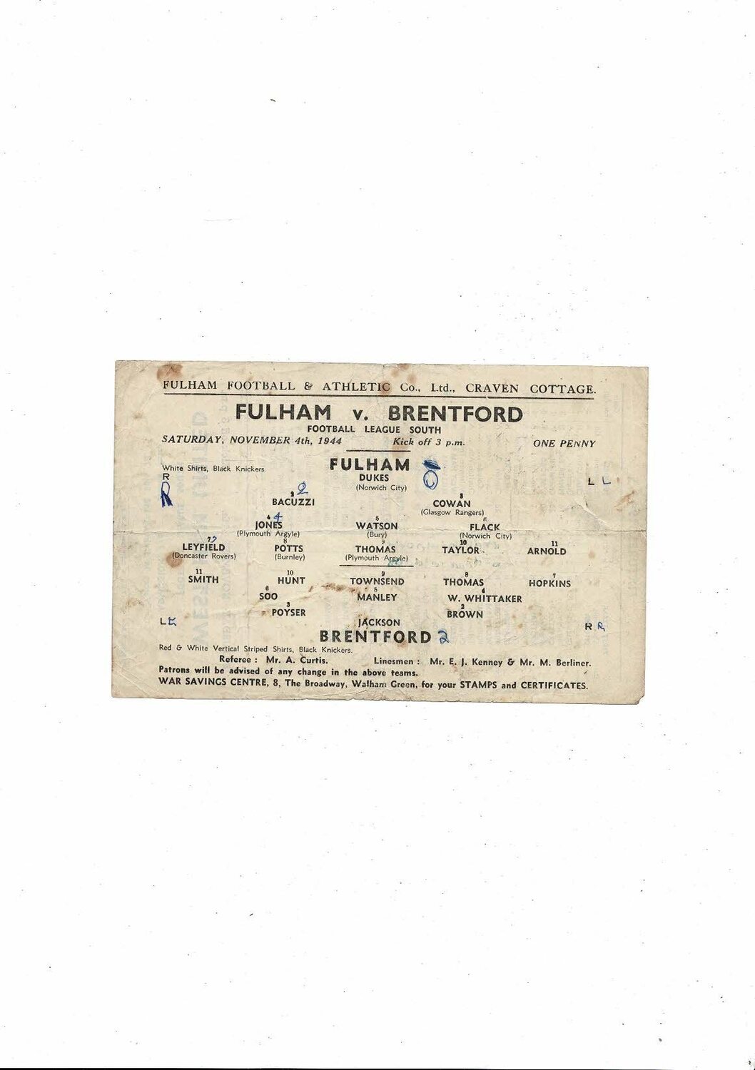 1944/45 Fulham v Brentford Football Programme