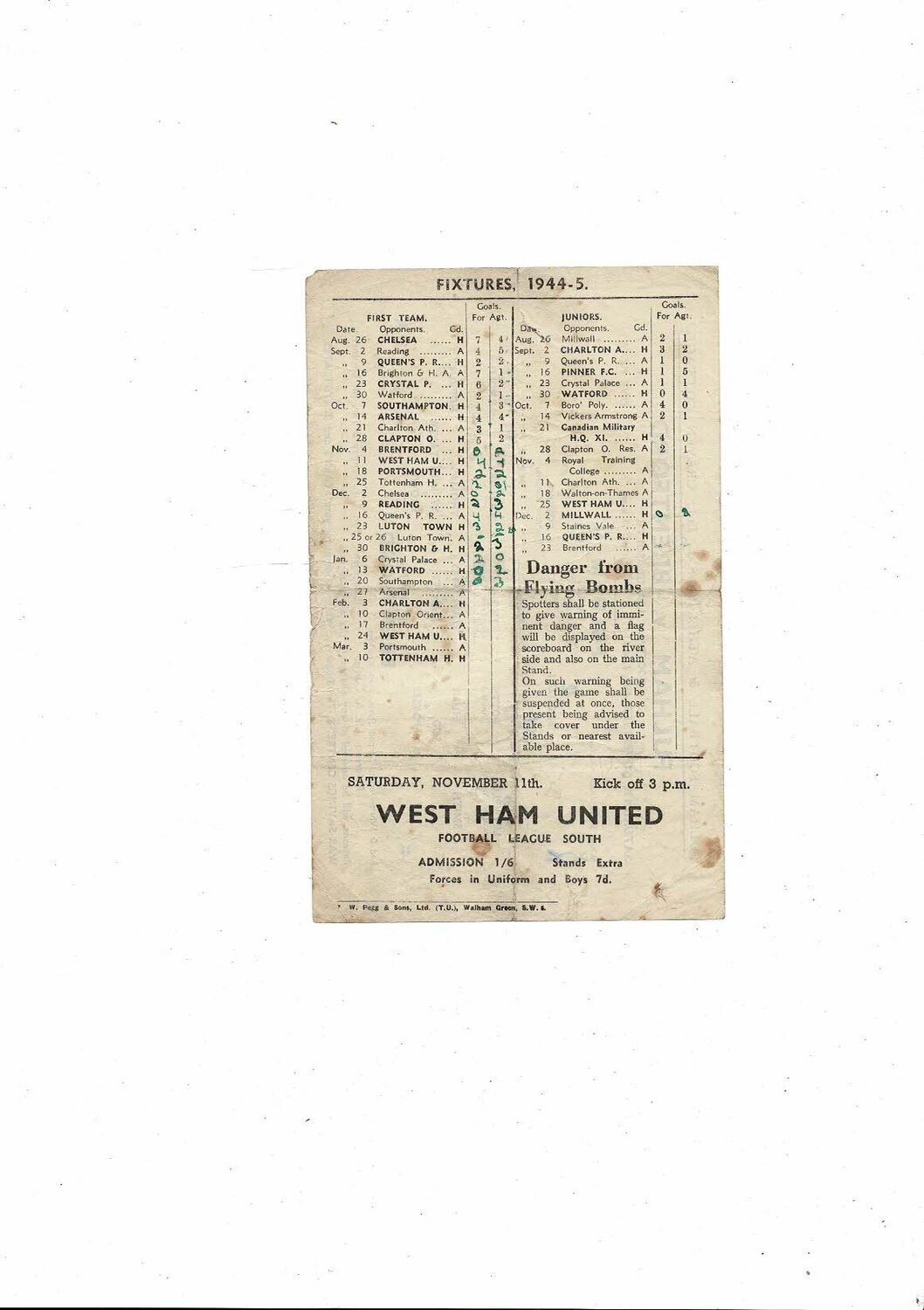 This original single sheet Football Programme is creased & folded with some staining, several tears, tiny corner piece missing, score, scorers, some results & other writing noted. Please see scans