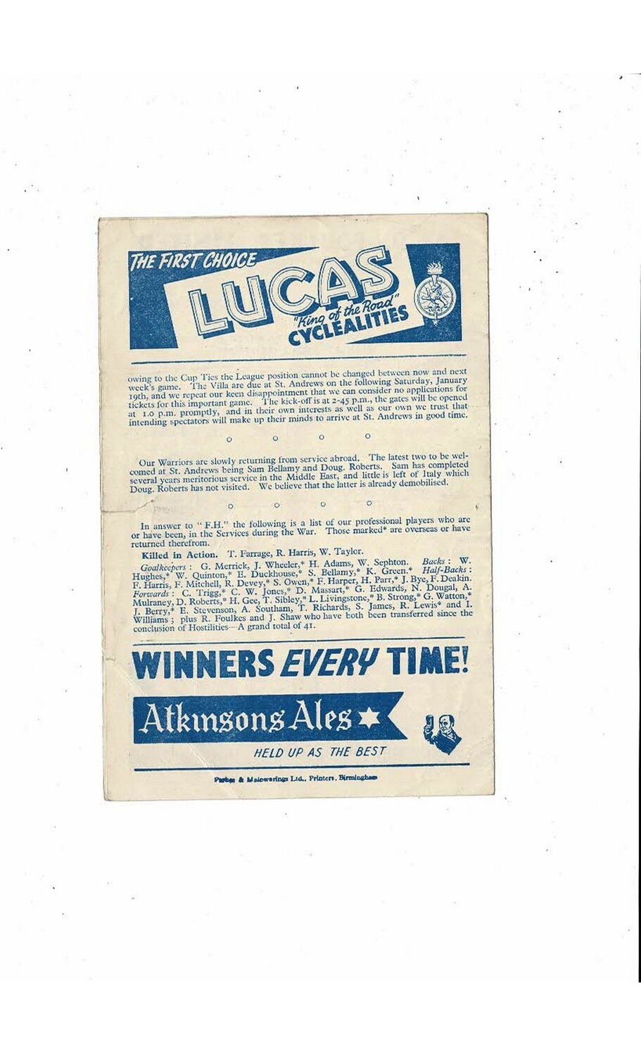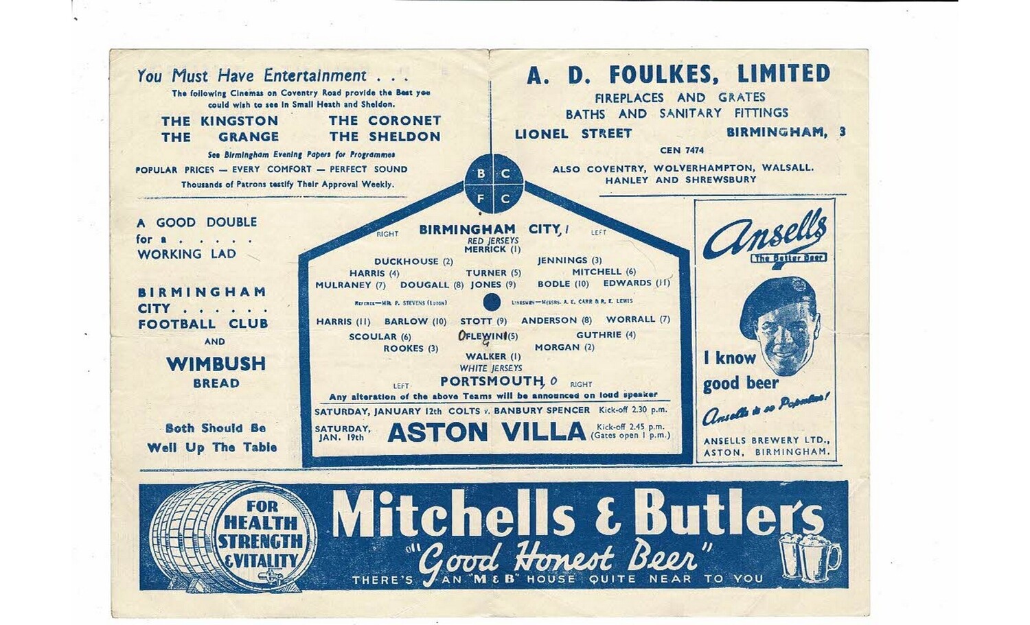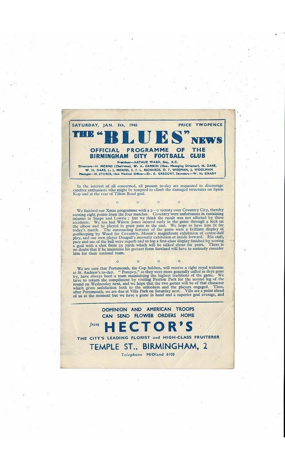 1945/46 Birmingham City v Portsmouth War Cup Football Programme