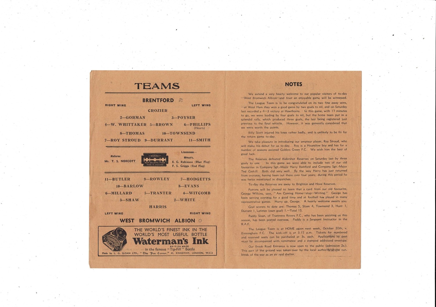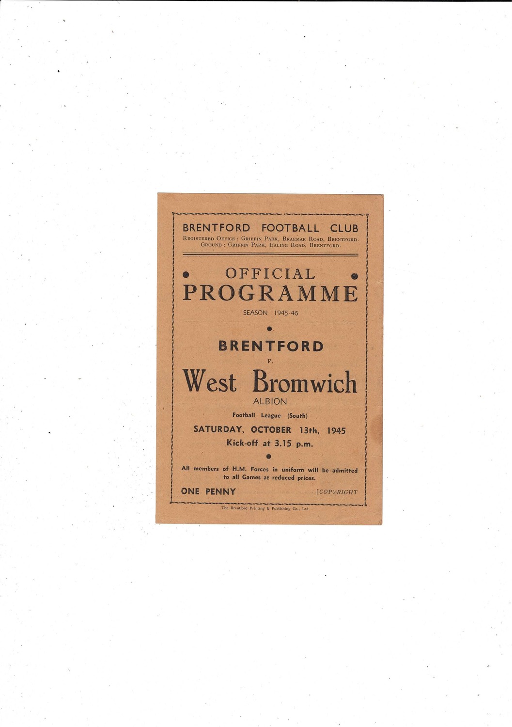 1945/46 Brentford v West Bromwich Albion Football Programme