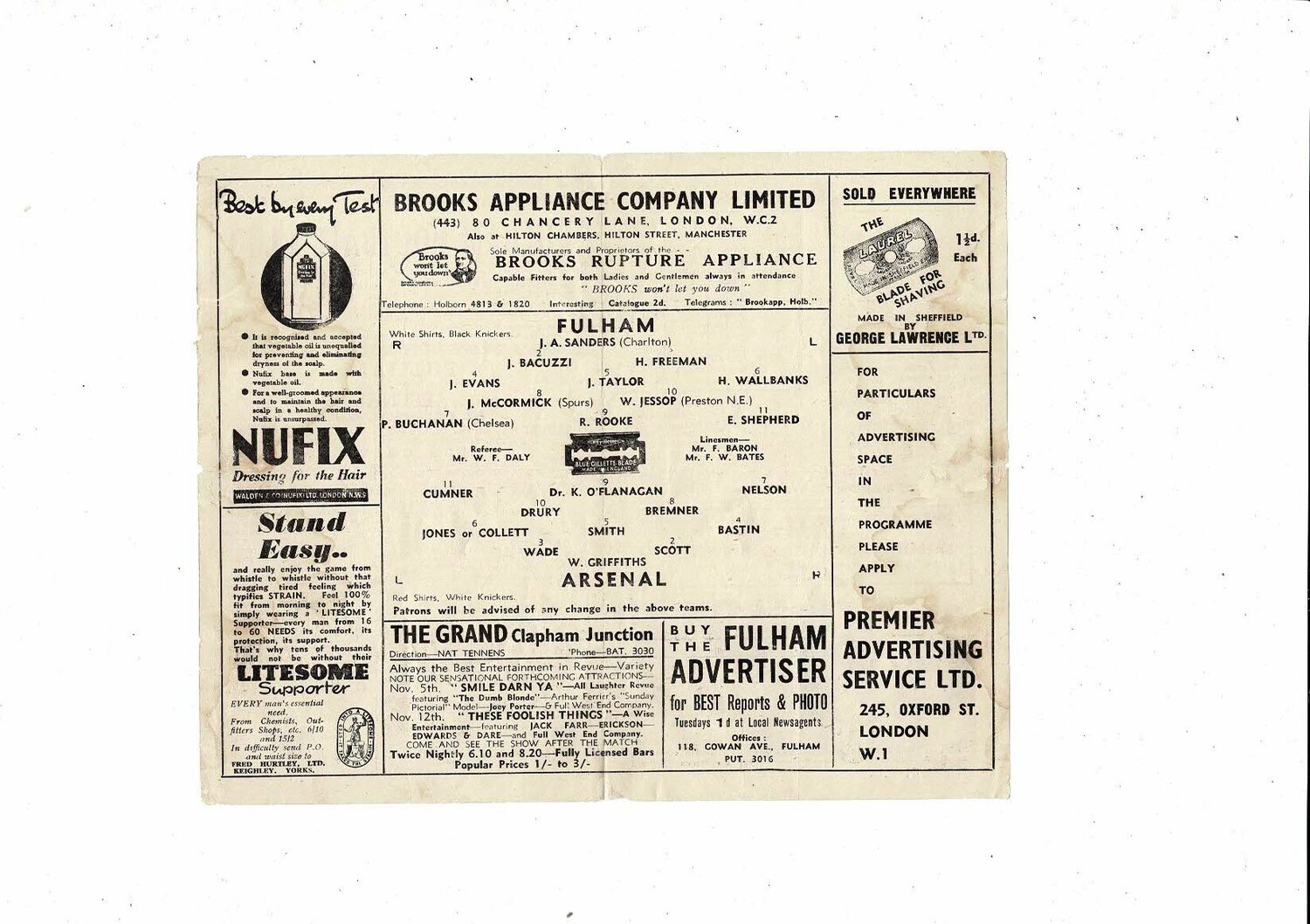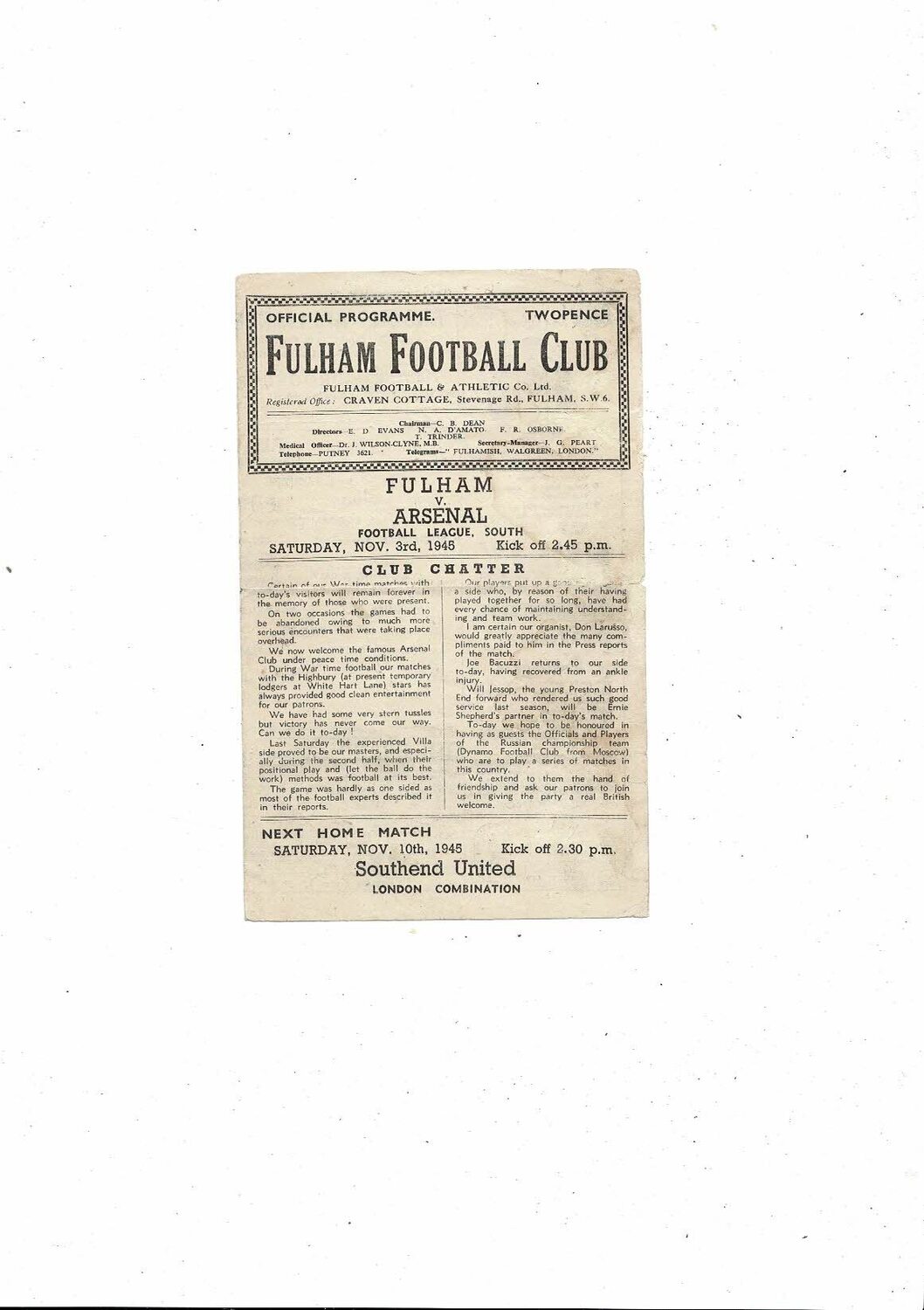 1945/46 Fulham v Arsenal Football Programme