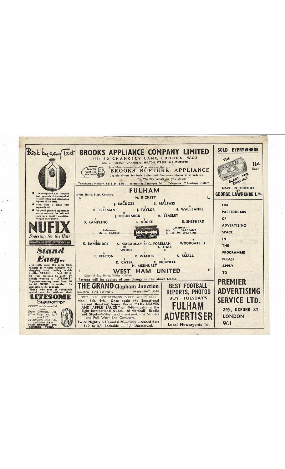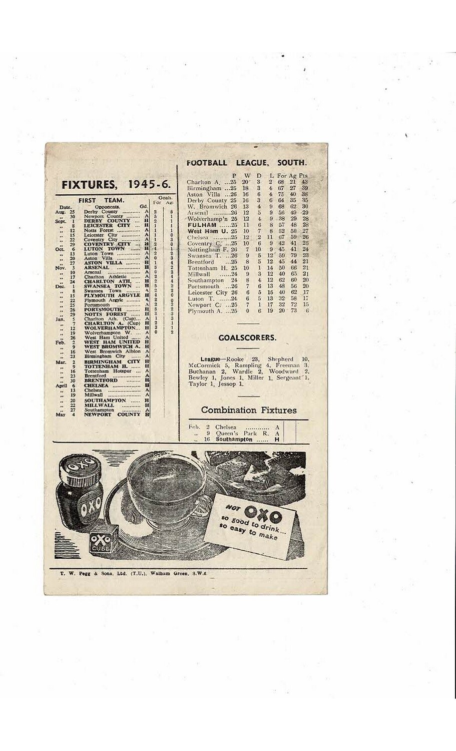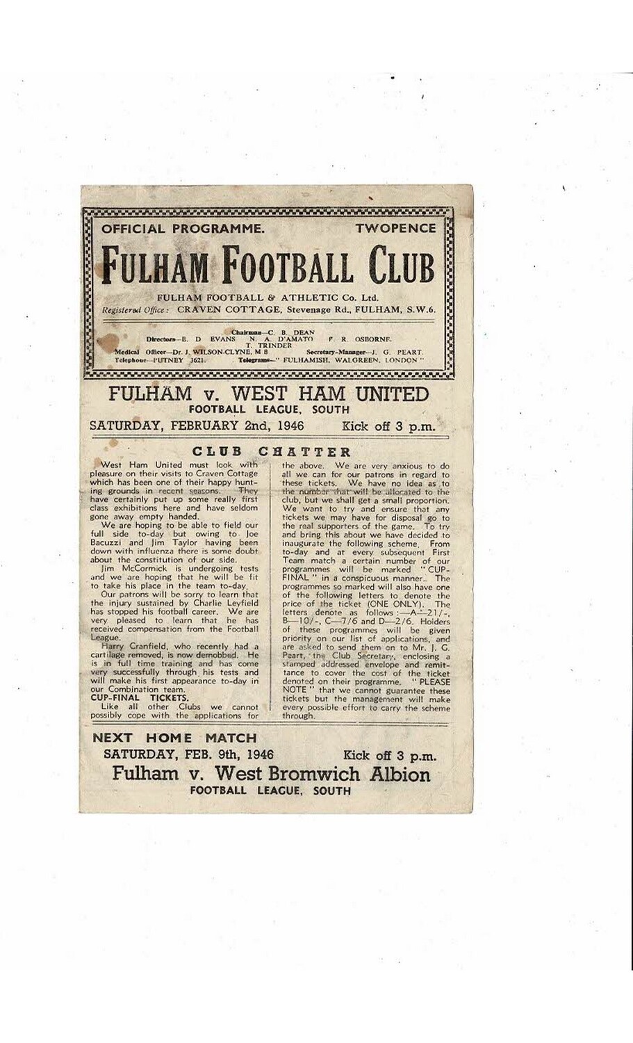 1945/46 Fulham v West Ham United Football Programme