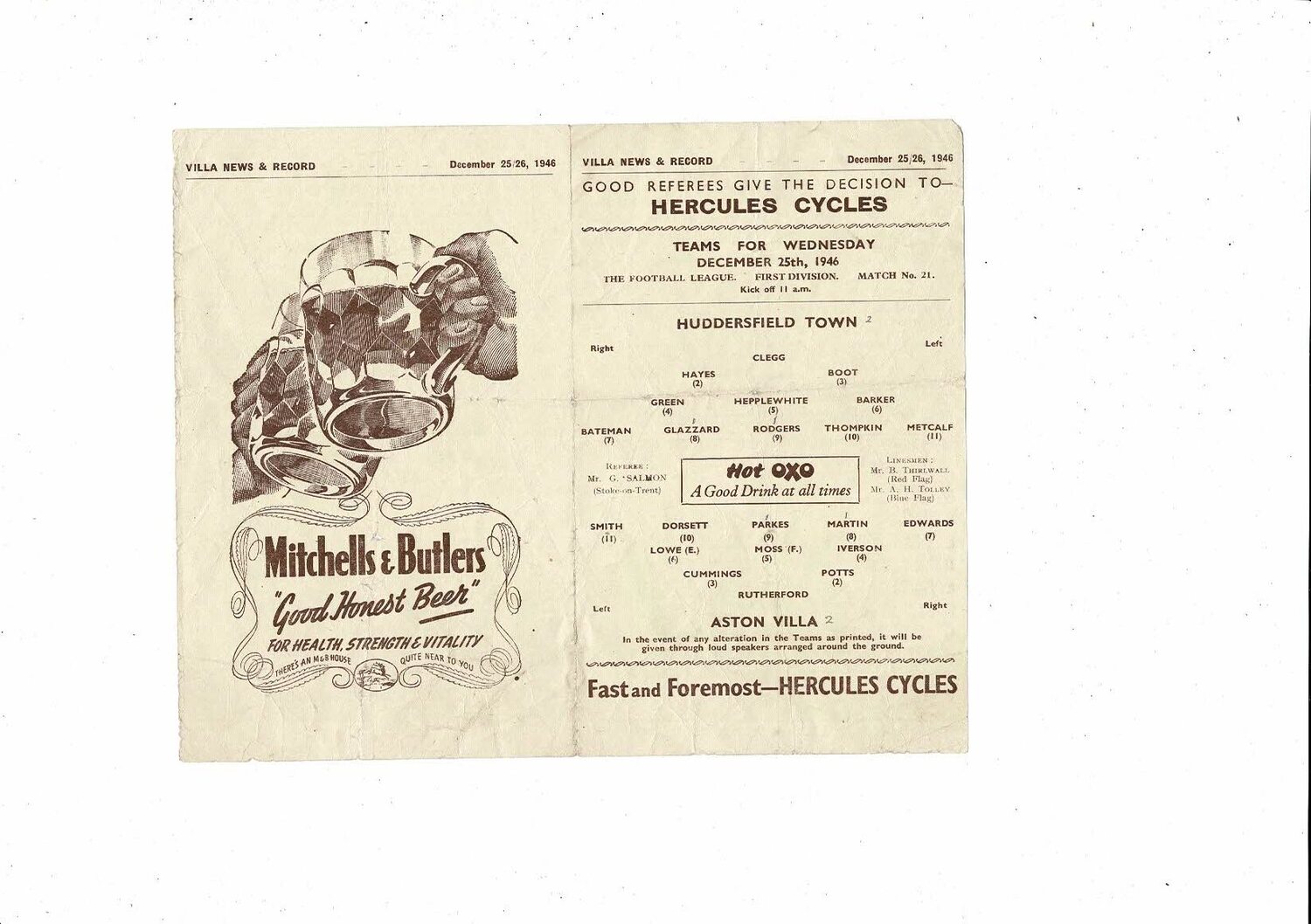 This Original Football Programme is creased & folded with some staining, several tiny tears & tiny holes with score & scorers neatly noted