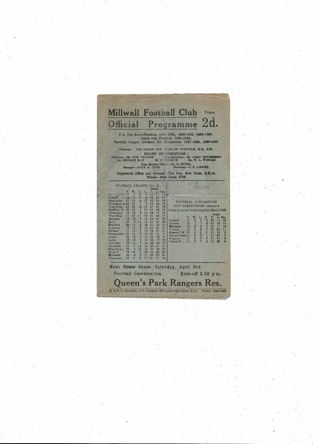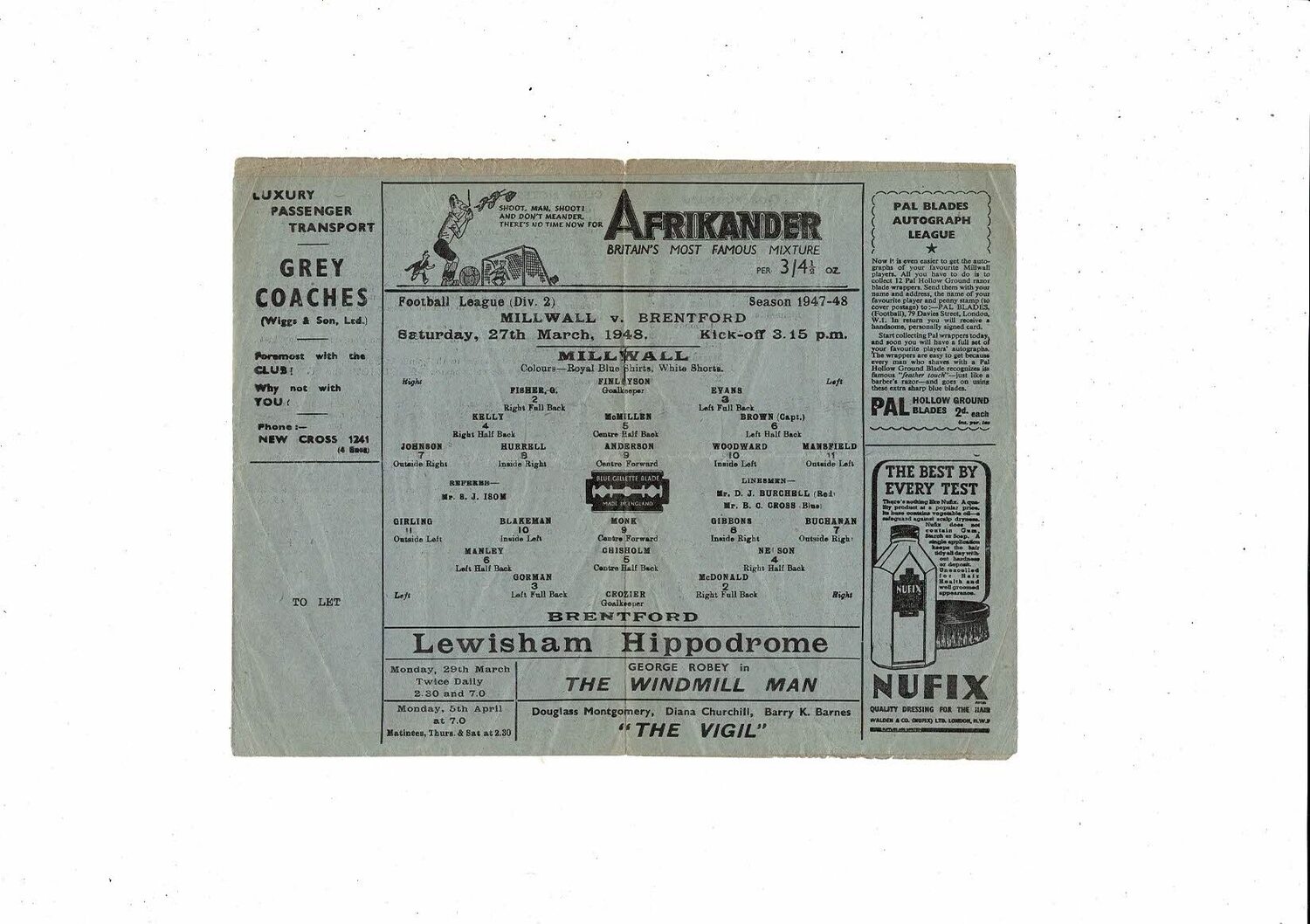 1947/48 Millwall v Brentford Football Programme