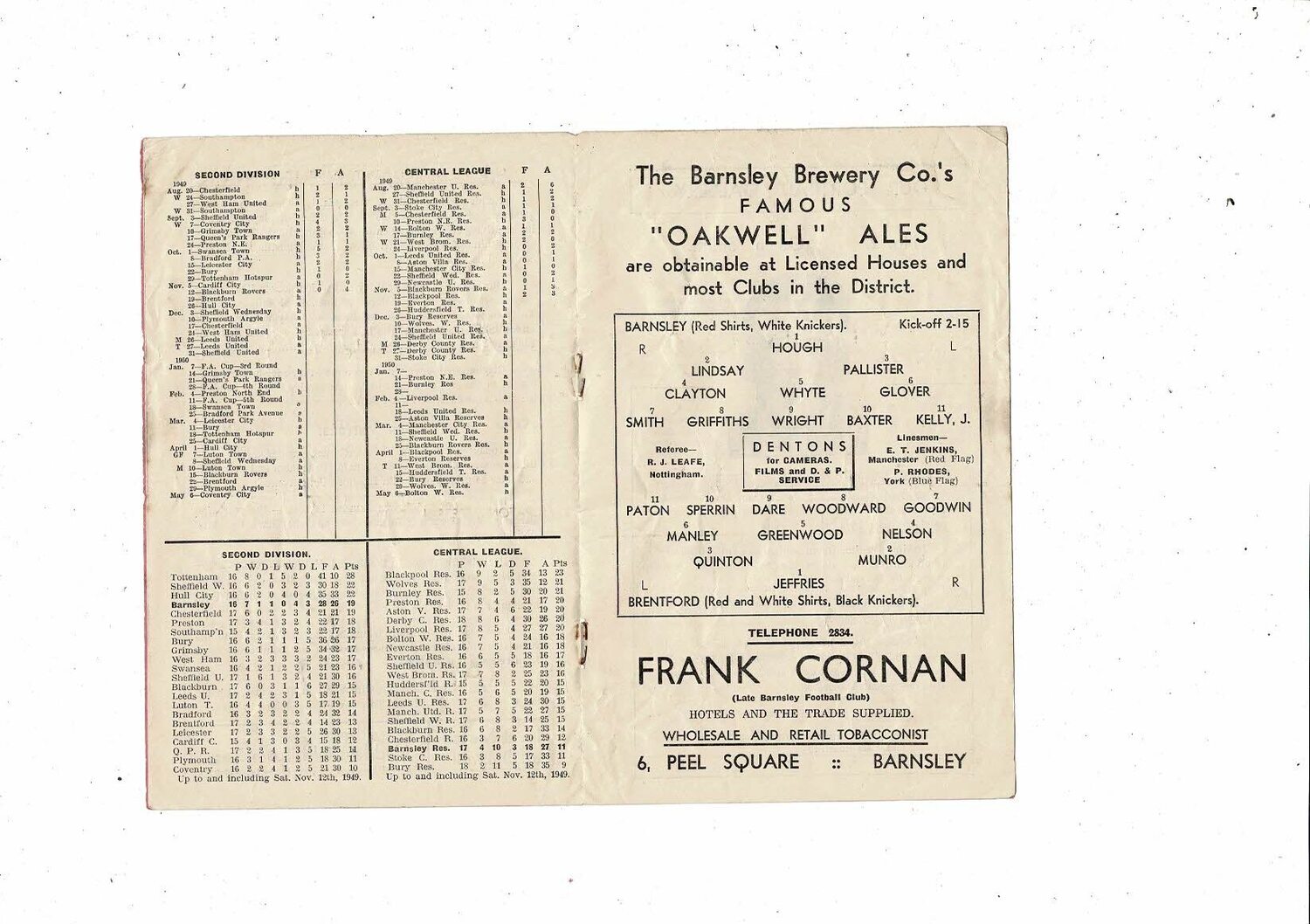 1949/50 Barnsley v Brentford Football Programme