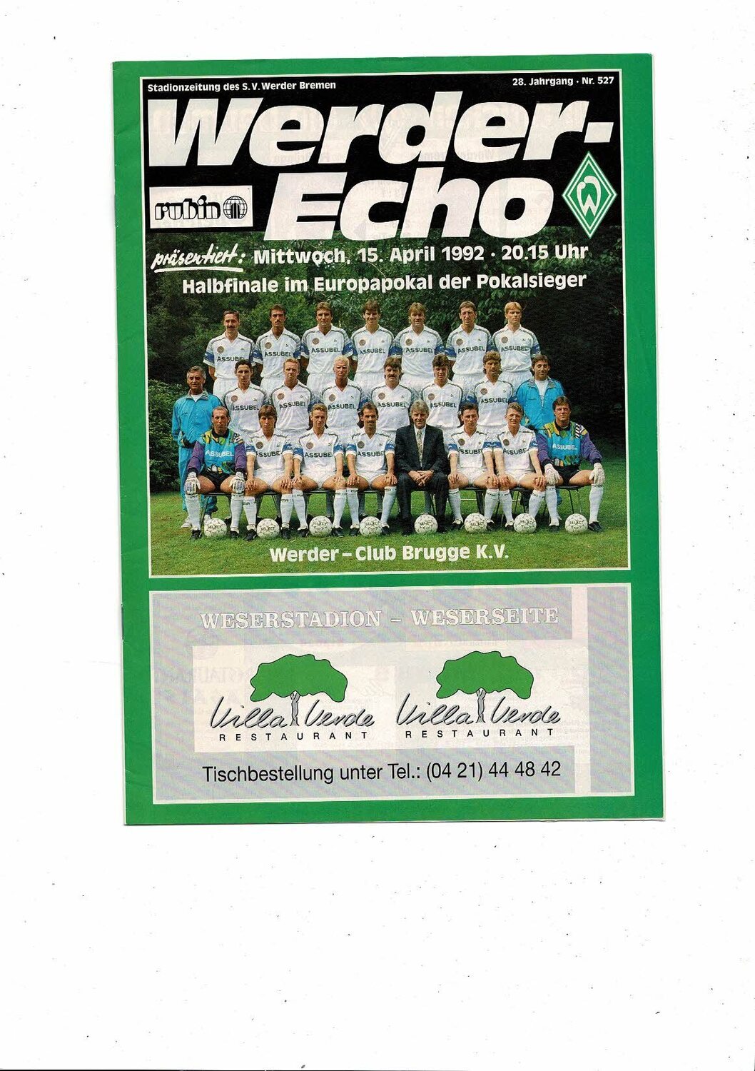 1991/92 Werder Bremen v Brugge European Cup Winners Cup Semi Final Football Programme