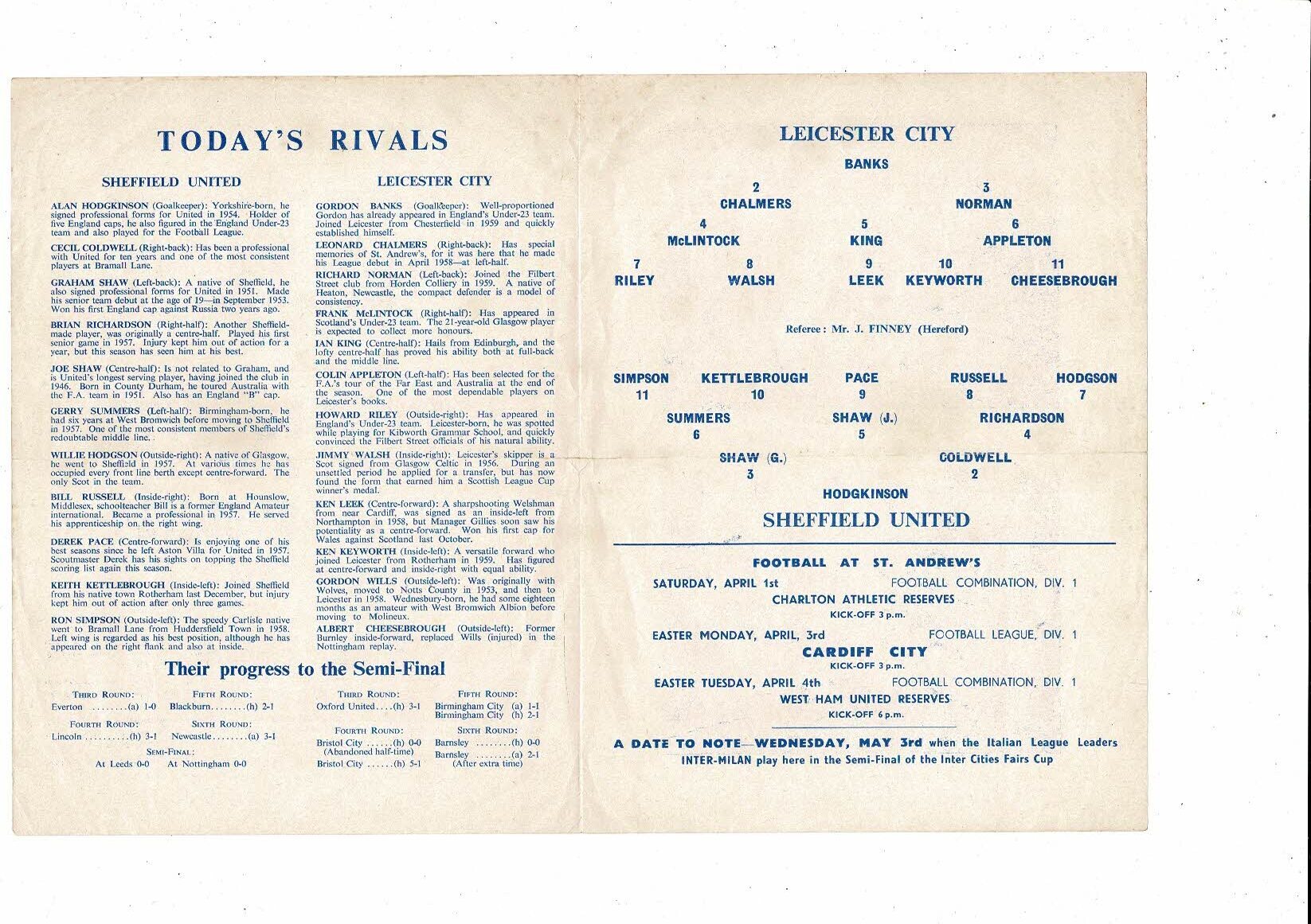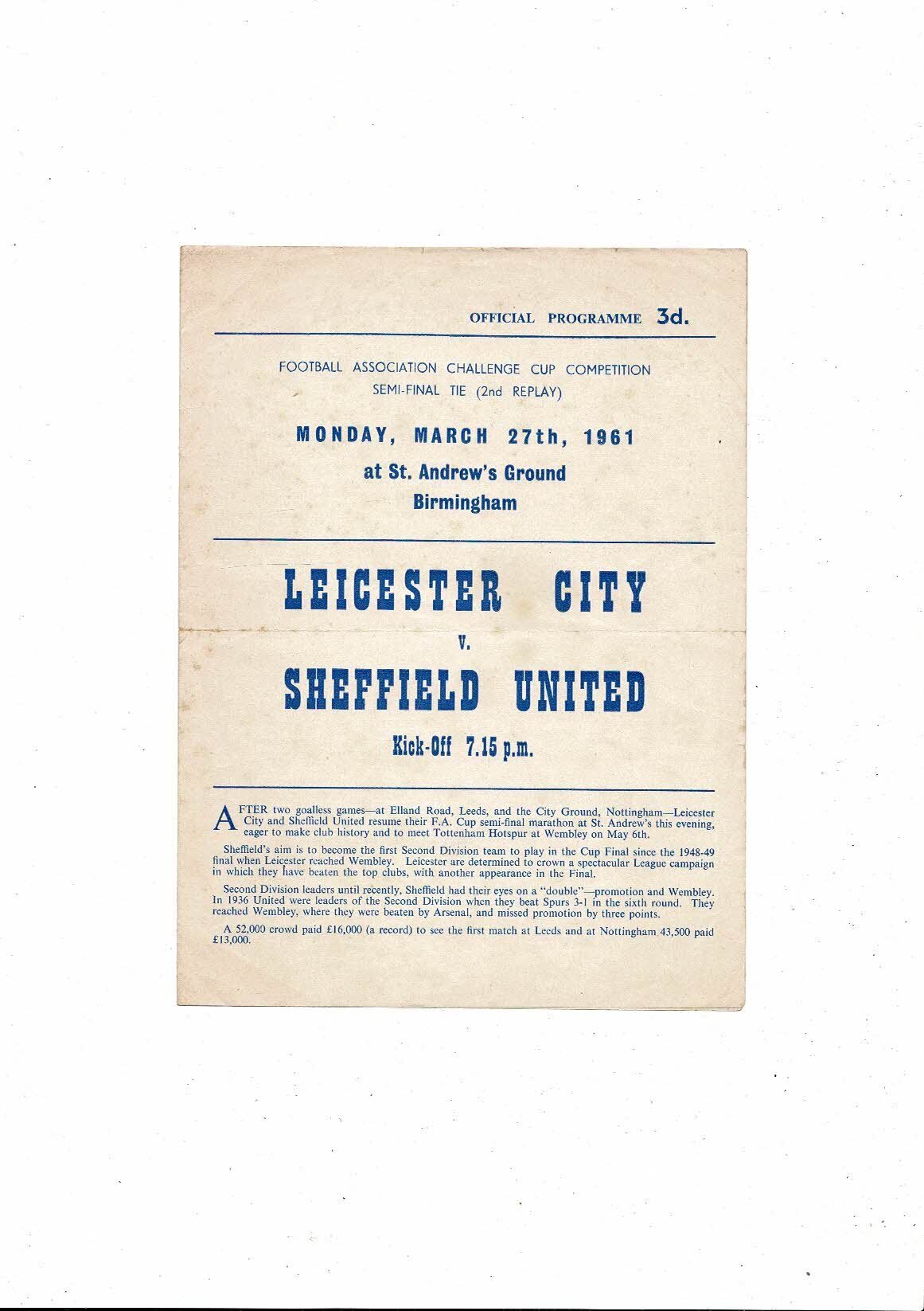 1961 Leicester City v Sheffield United FA Cup Semi Final 2nd Replay Football Programme