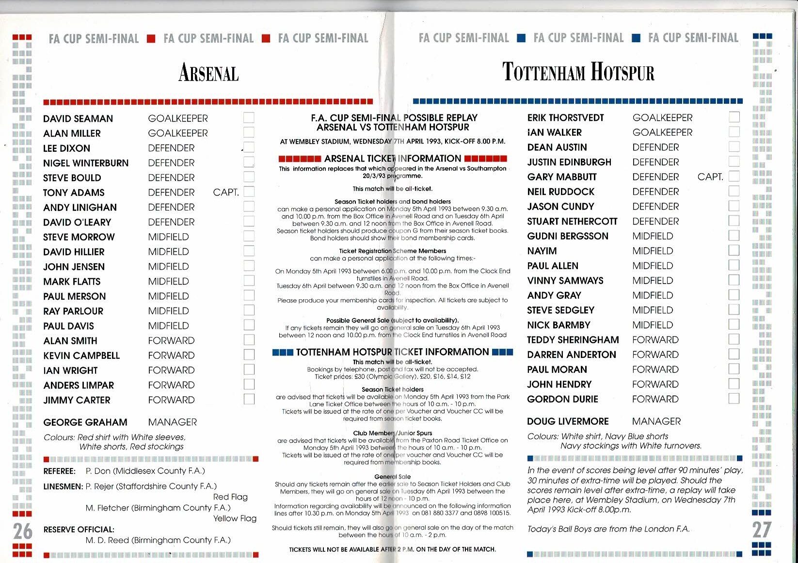 1993 Arsenal v Tottenham Hotspur FA Cup Semi Final Football Programme