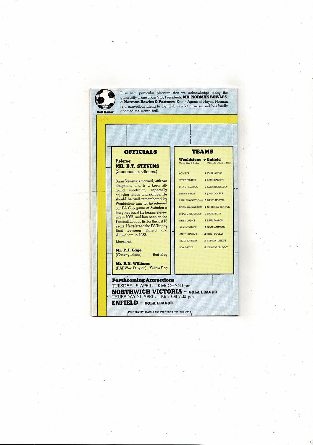 1984/85 Wealdstone v Enfield Trophy Semi Final Football Programme