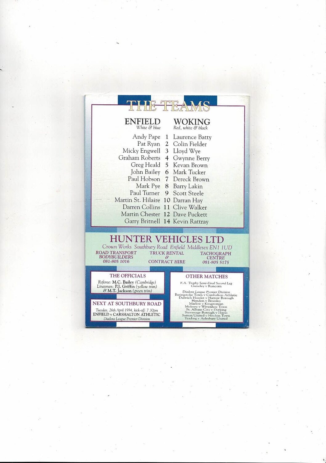 1993/94 Enfield v Woking Trophy Semi Final Football Programme