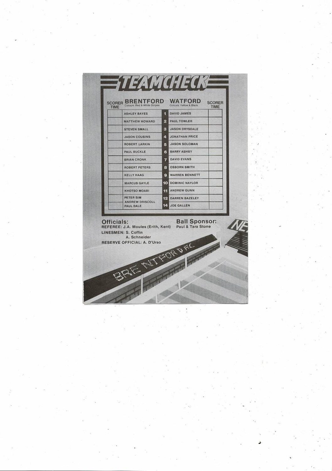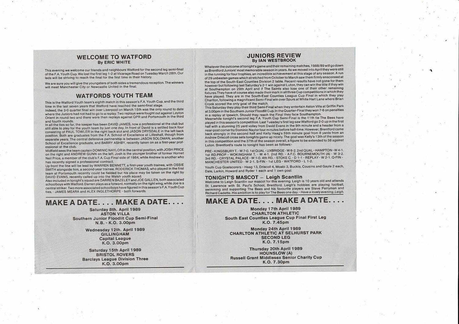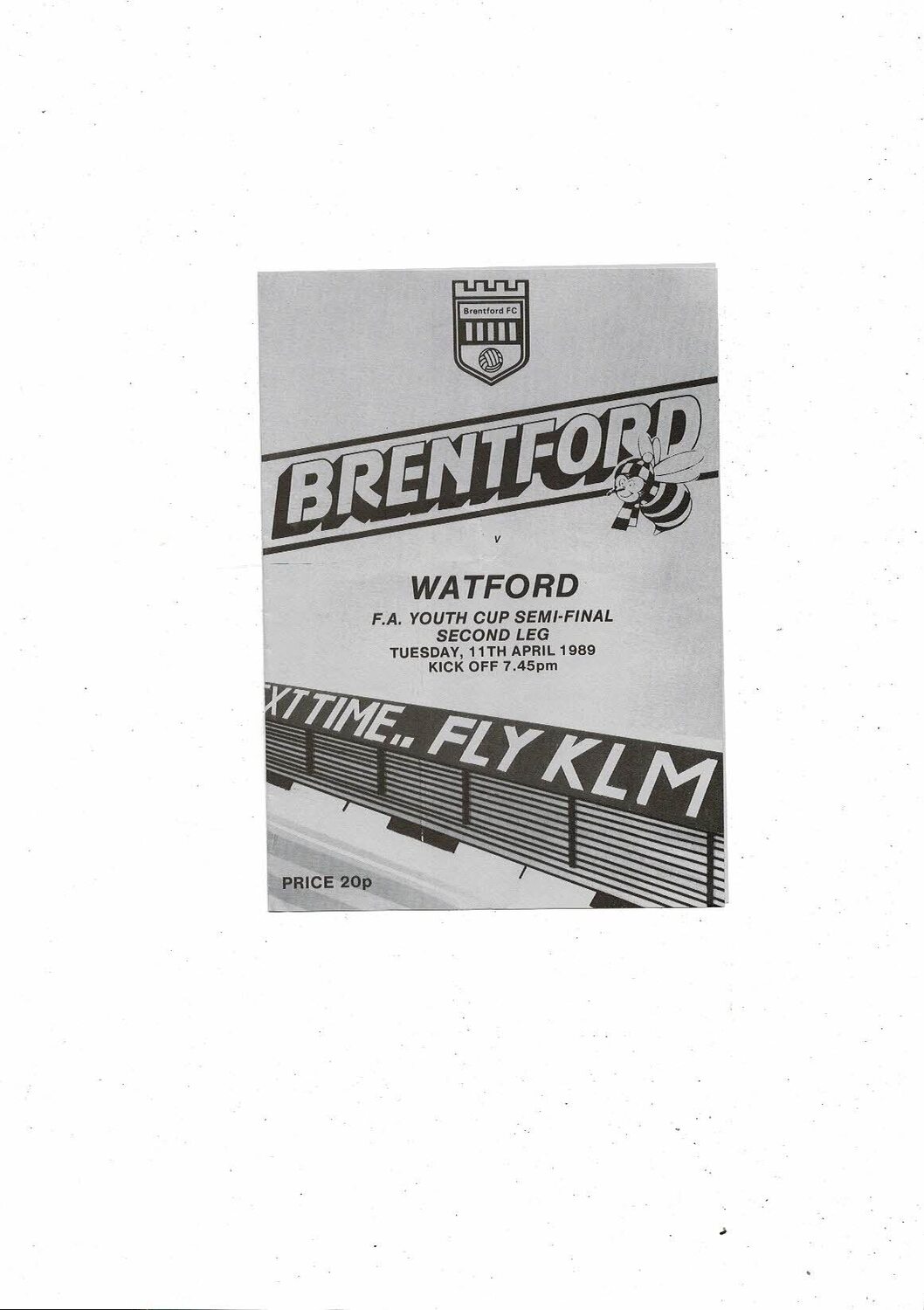 1988/89 Brentford v Watford FA Youth Cup Semi Final Football Programme