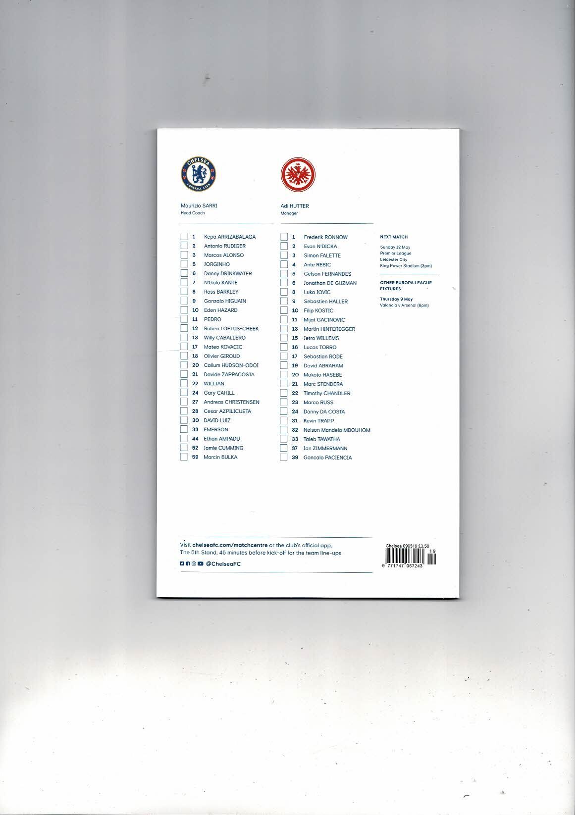 2019 Chelsea v Eintracht Frankfurt Europa League Semi Final Football Programme