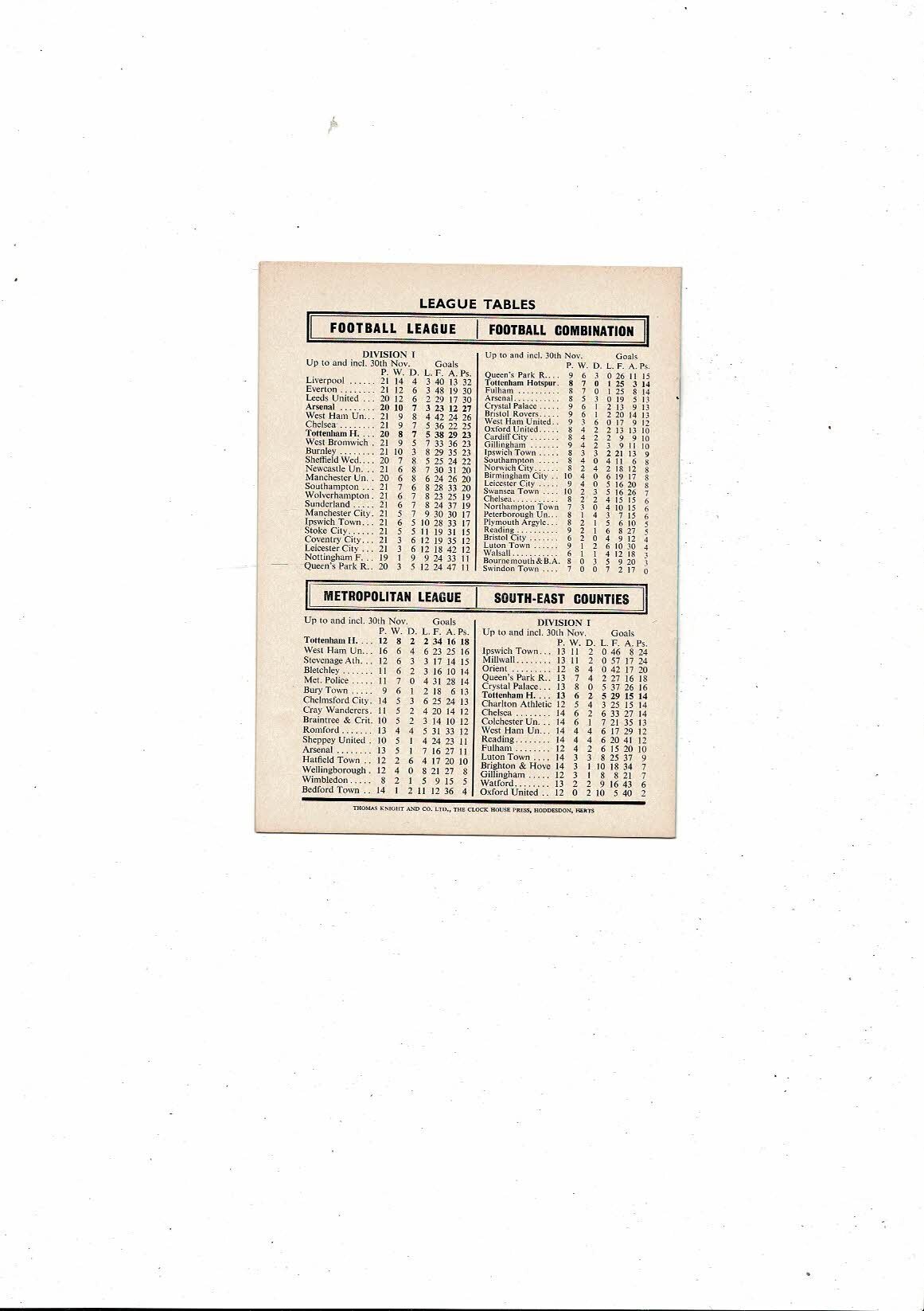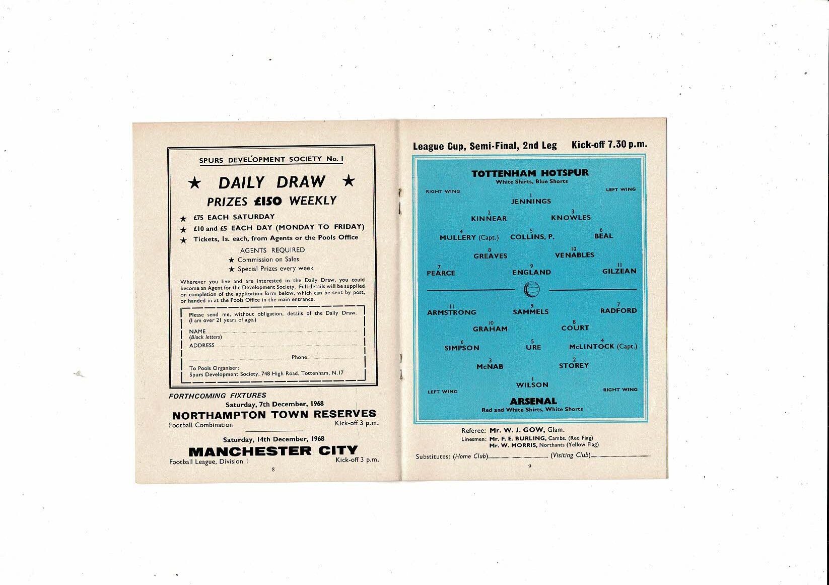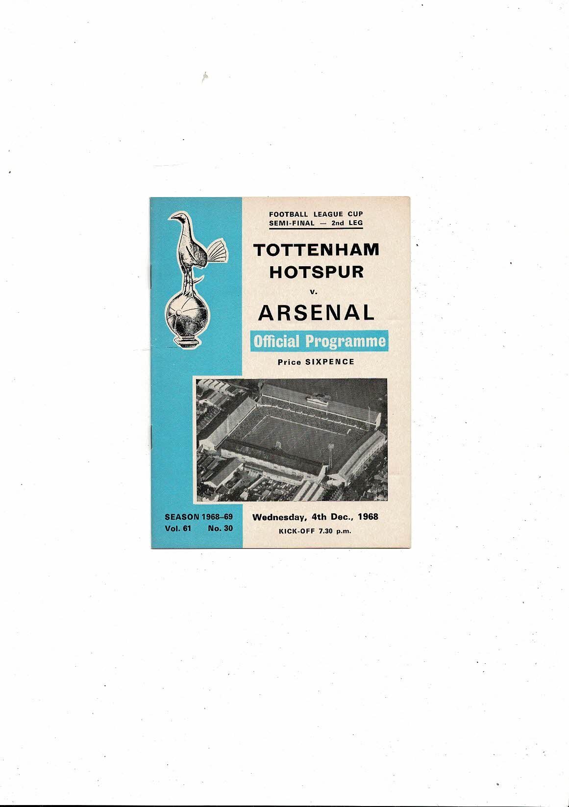 1968/69 Tottenham Hotspur v Arsenal League Cup Semi Final Football Programme