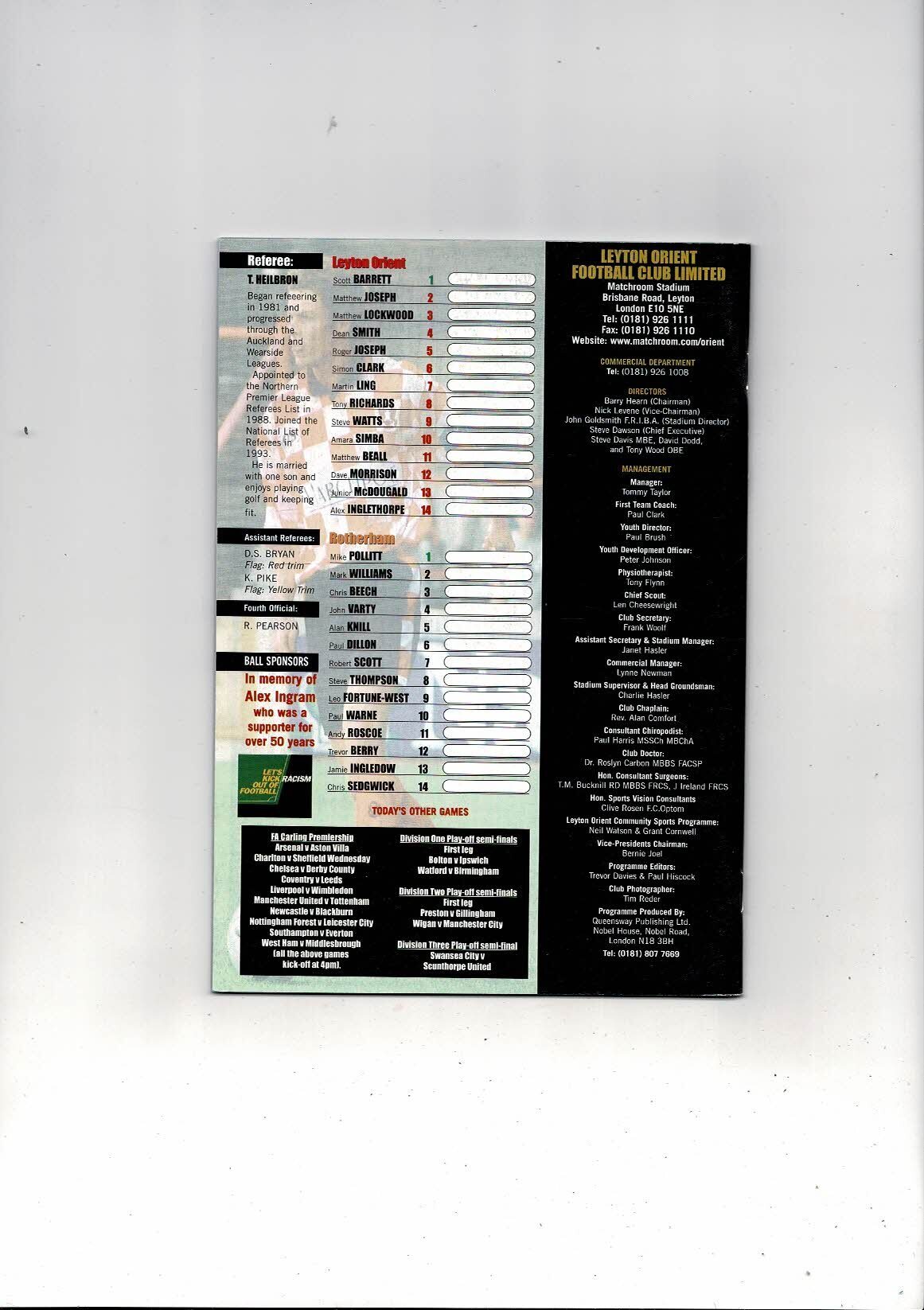 Leyton Orient v Rotherham United Play Off Football Programme 1998/99