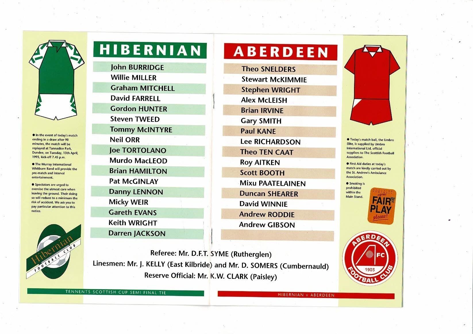 1993 Hibernian v Aberdeen Scottish Cup Semi Final Football Programme