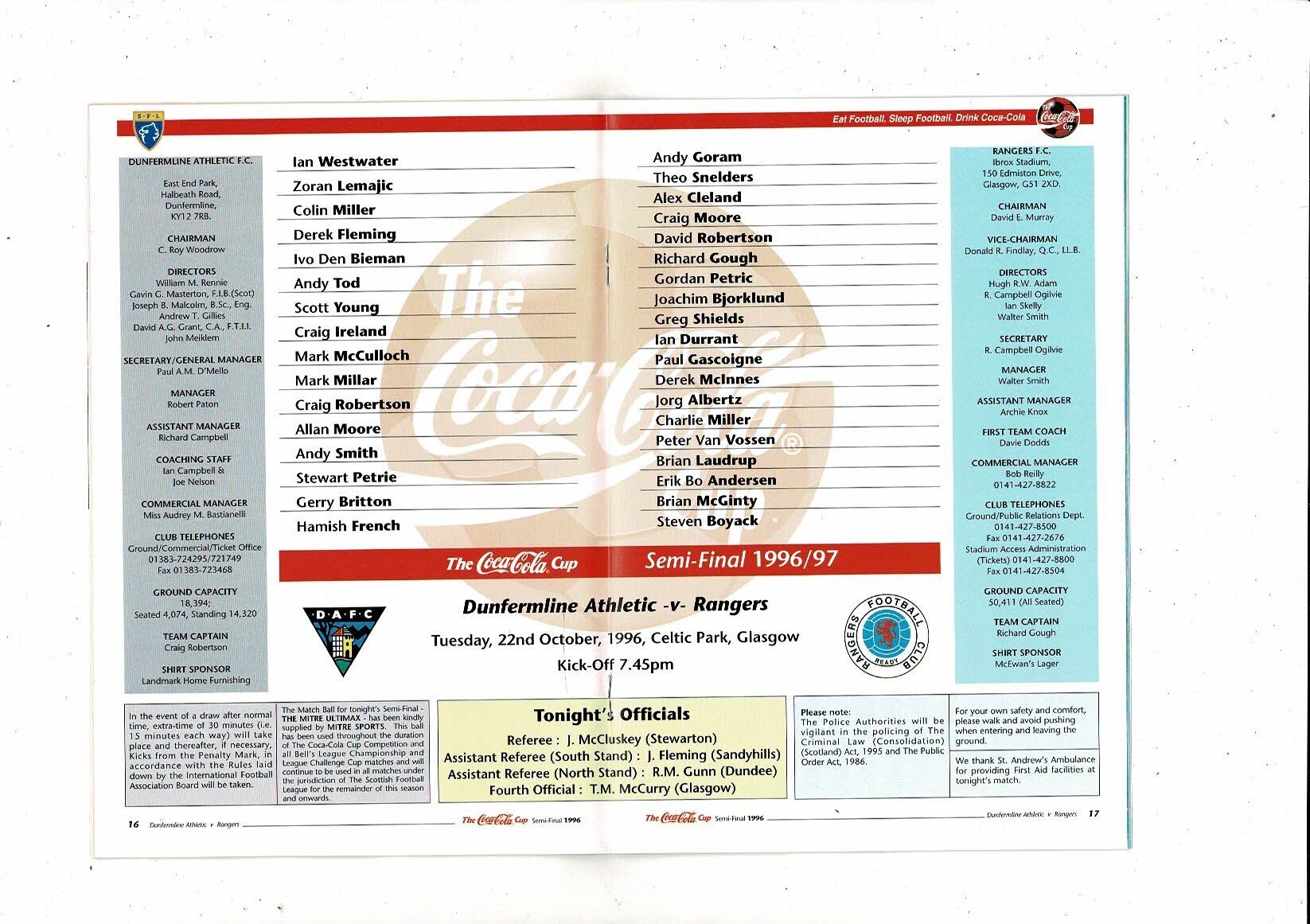1996/97 Dunfermline v Rangers Scottish League Cup Semi Final Football Programme
