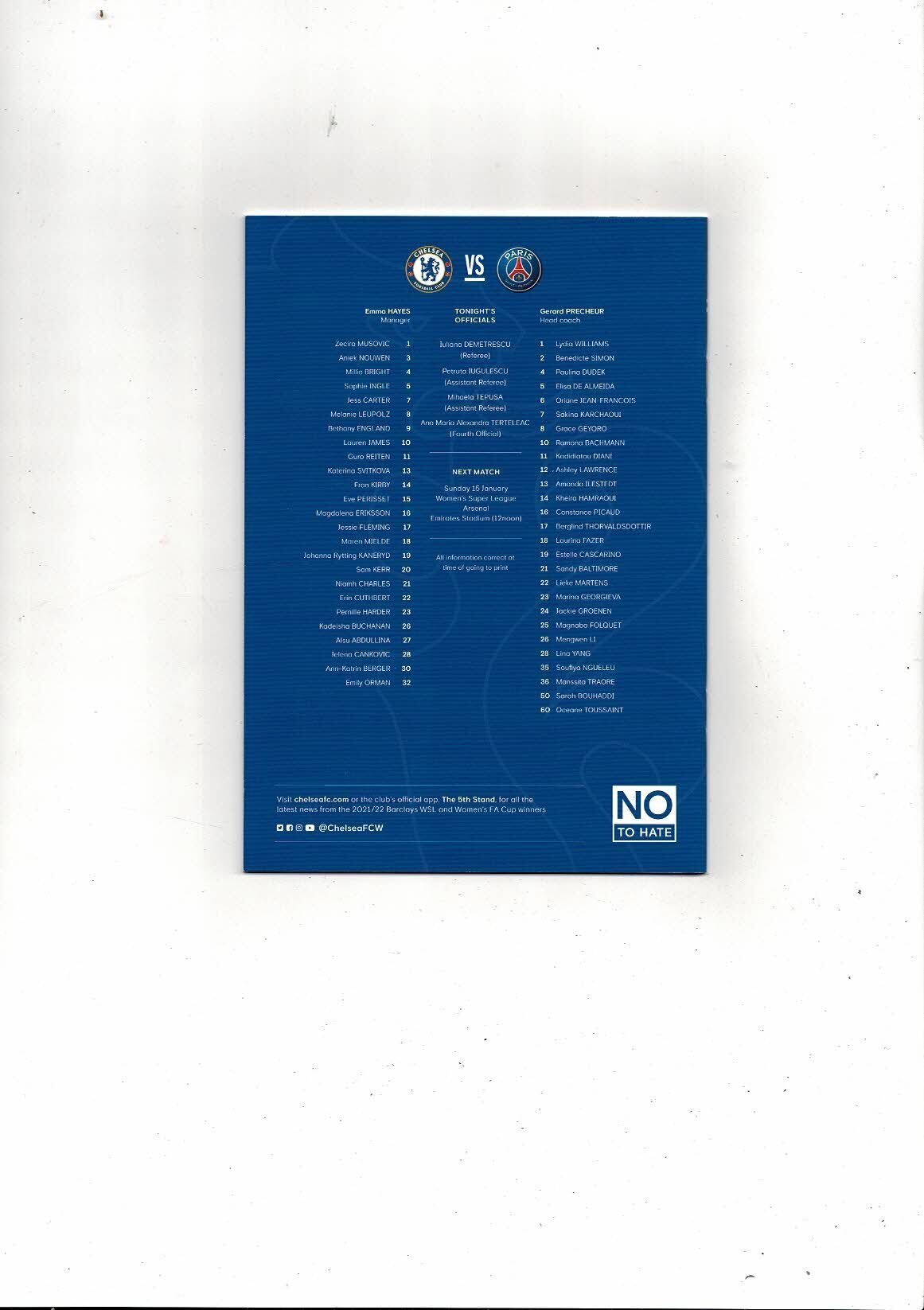 2022/23 Chelsea v Paris Saint Germain Womens Champions League Football Progamme