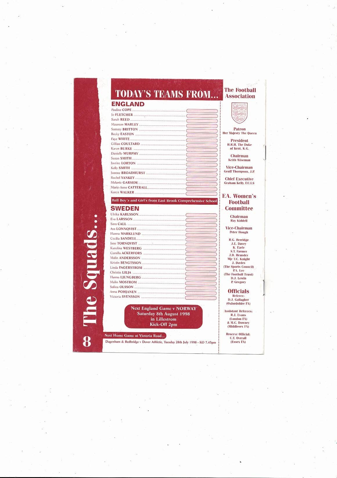 1998 England v Sweden Women's International Football Programme @ Dagenham