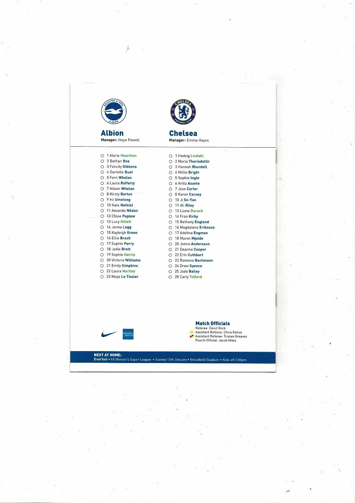 2018/19 Brighton v Chelsea Womens Super League Football Programme