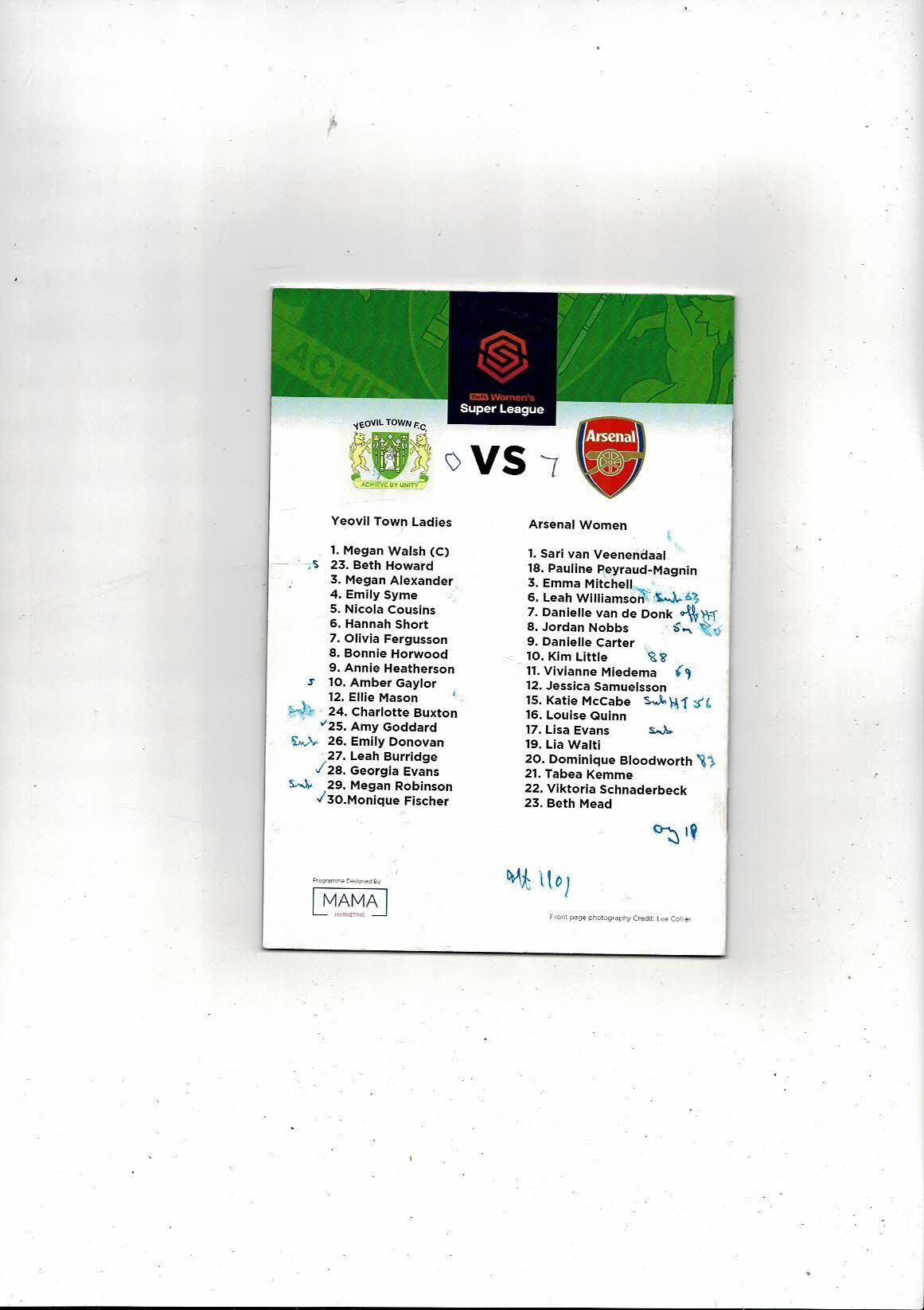 2018/19 Yeovil Town v Arsenal Womens Super League Football Programme