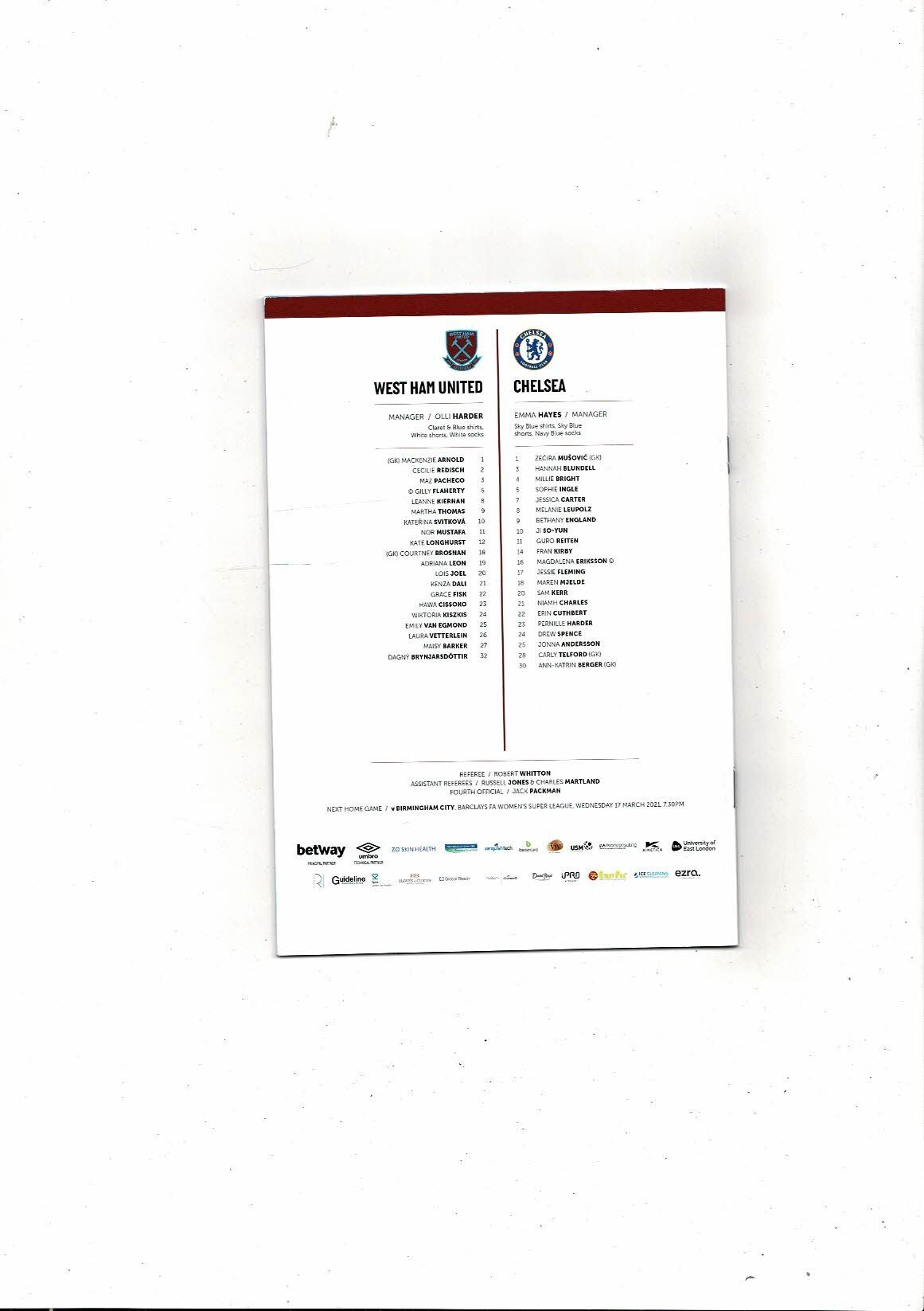 2020/21 West Ham United v Chelsea Womens Super League Football Programme
