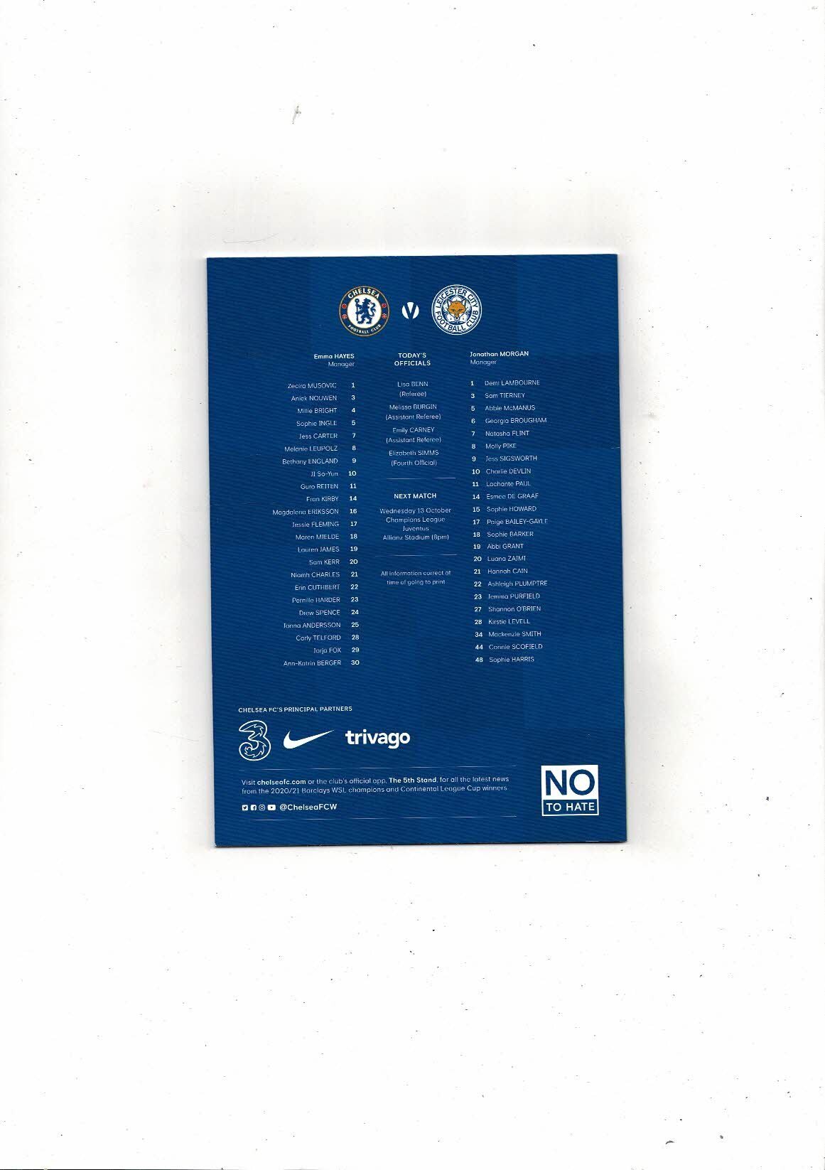 2021/22 Chelsea v Leicester City Womens Super League Football Programme