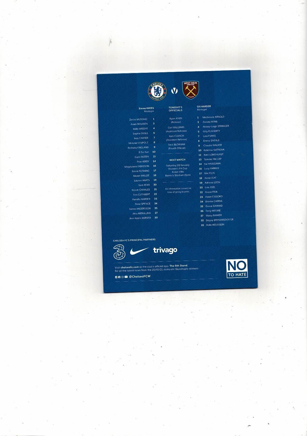 2021/22 Chelsea v West Ham United Womens Super League Football Programme